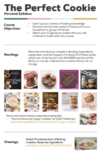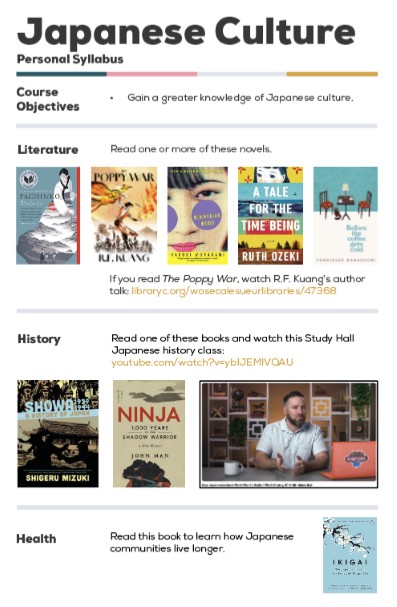 Library staff can help you create your own personal syllabus in order to customize learning goals that match your current interests. Your own syllabus could include multiple subject areas or focus on one. The point is to learn for the sake of curiosity or to learn creative skills.